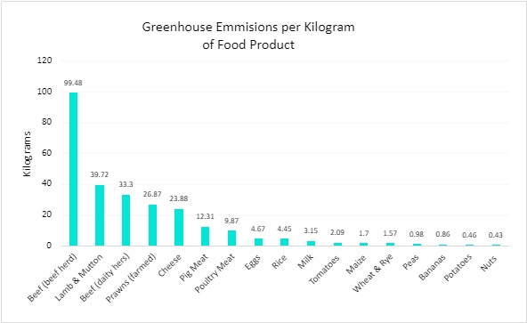 Food production and consumption make up more than 20% of global greenhouse emissions and 15% of that comes from livestock; bovine meat is the greatest culprit having the least efficient calorie conversion ratio from feed input and subsequent food output.1