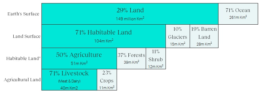 Concurrently, there is a significant strain on land available to produce food. While global farmland for livestock makes up 77% of the total, that livestock represents only 18% of global human calorie intake, making for an inefficient use of a finite resource.3