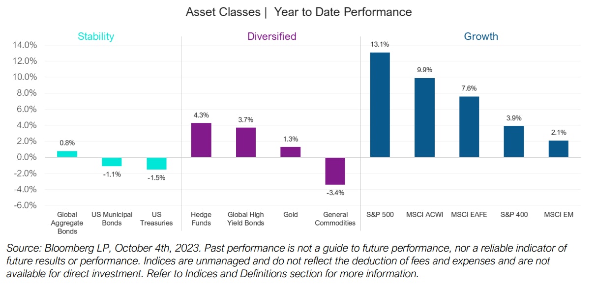 Diversified: Hedge funds, high-yield bonds (credit) and gold remain important diversifiers and are still positive year to date. The rise in oil prices has led commodity returns to be less negative.